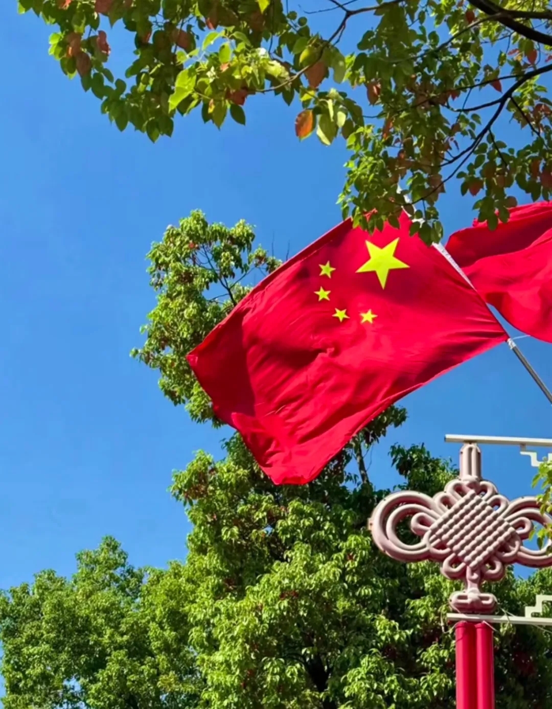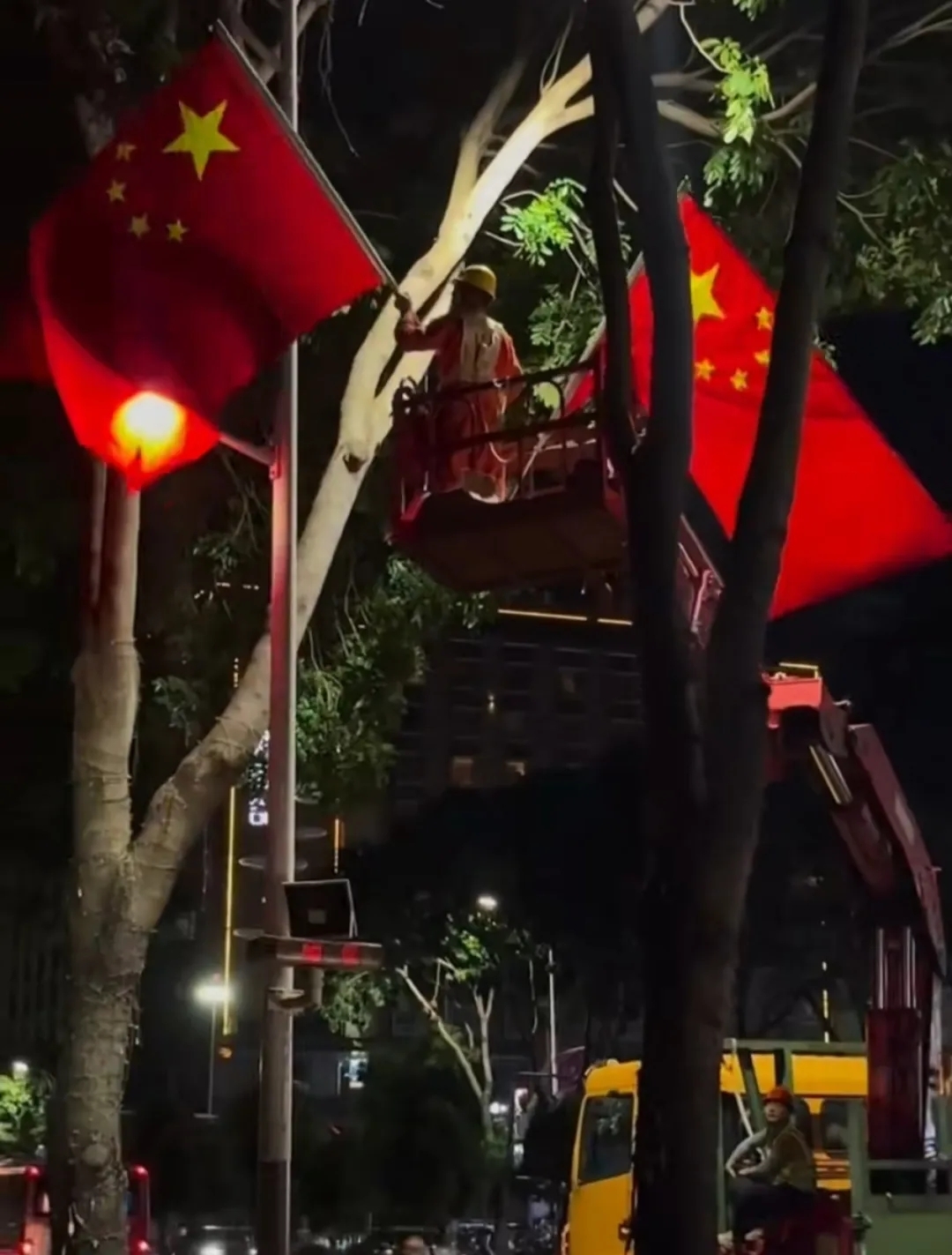 我拍下工人在街道两边路灯挂国旗的画面。他们动作认真,充满对祖国的敬意。行人驻足,尽显家国情怀。此景触动人心,展现国家凝聚力。
