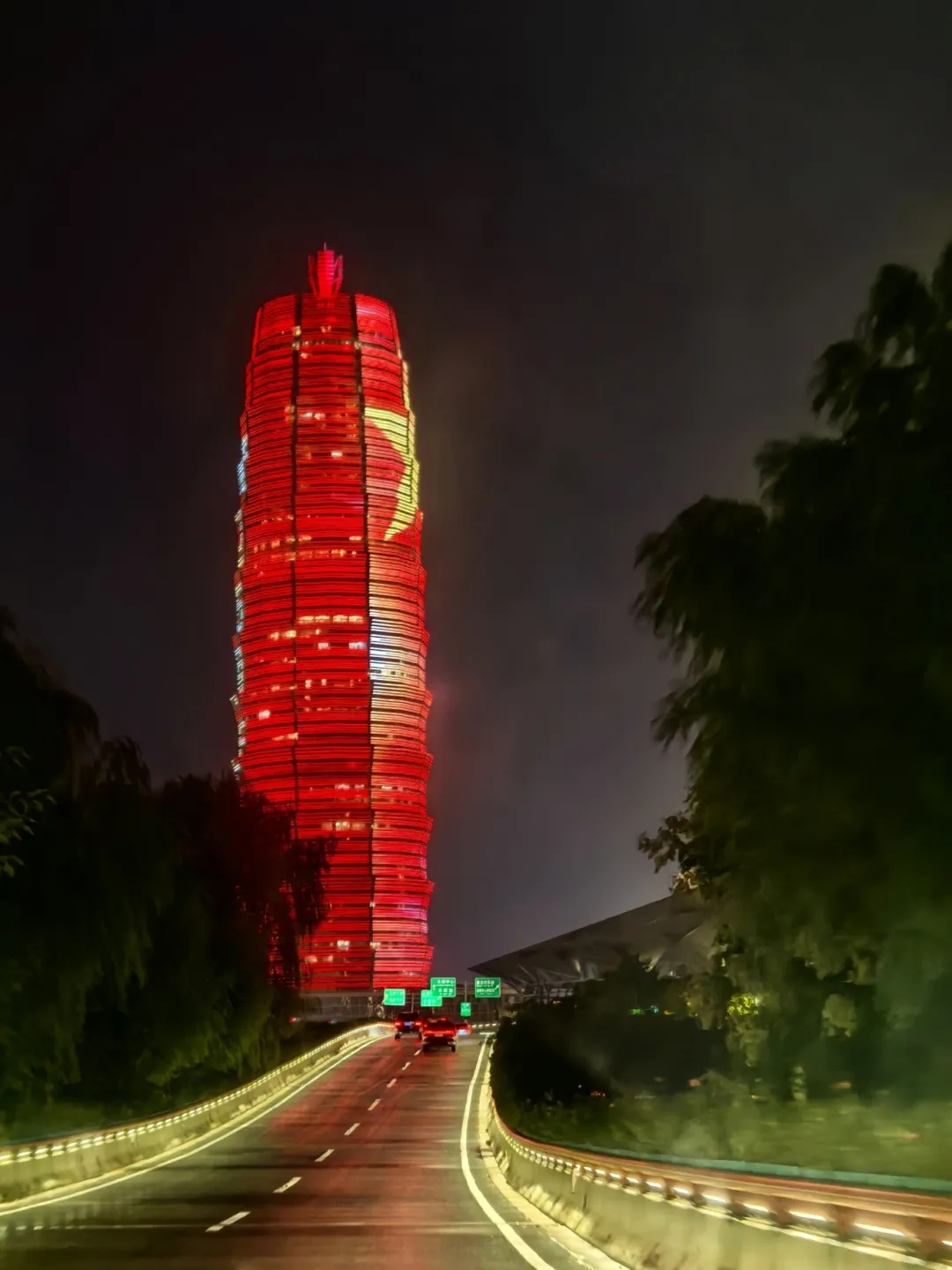 这张图片拍摄于回家的路上,从宏观的角度展示了城市建筑群在灯光秀下的壮丽景象,体现了城市的发展和繁荣。大面积的灯光色彩,既具有视觉冲击力,又传达出强烈的国庆主题和爱国情怀,给我以振奋和自豪的感觉。