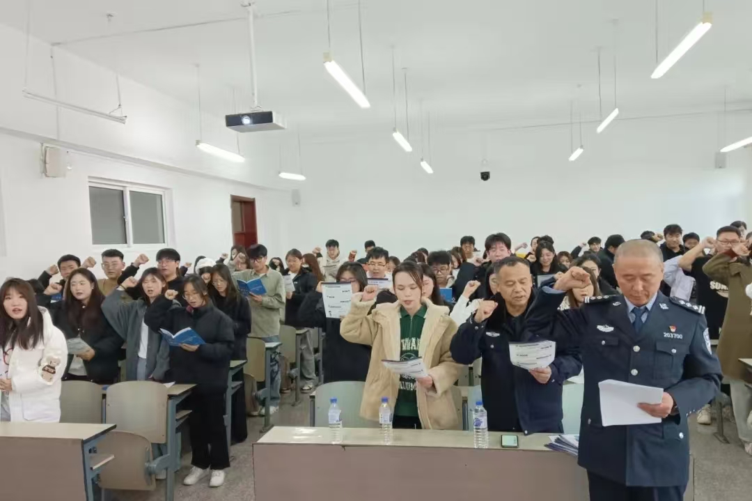 随后,车警官详细讲解高校诈骗五大常见形式,如网上刷单、冒充客服等,揭露其中套路。最后传授预防诈骗六条锦囊,鼓励大家与亲友交流防骗经验、勿贪小便宜等。此外,车警官为参会同学发放防诈骗手册和宣传单,带领大家宣誓。