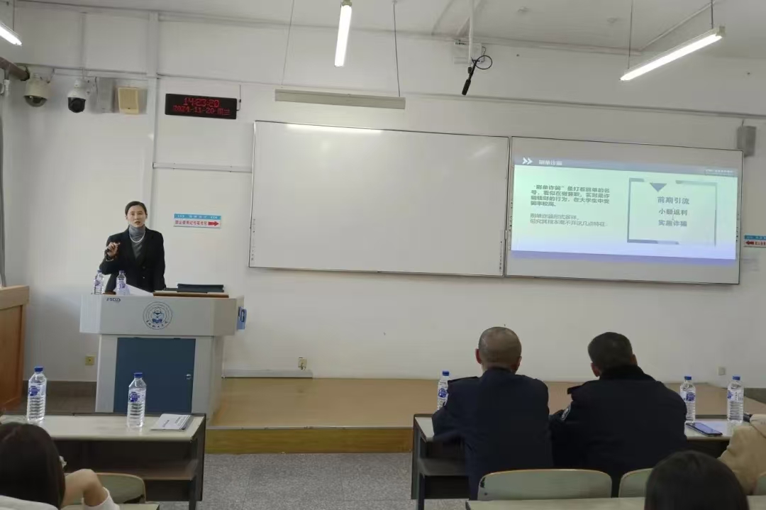 讲座伊始,车警官先列举冒充电商客服、刷单返利、虚假投资理财等校园诈骗典型案例,让同学们意识到诈骗近在咫尺。随后深入剖析高校诈骗三大特点:“自由组合诈骗”与“定制诈骗”交织致手段多变,作案形式多样且随科技更新,作案团伙组织严密、分工精细、欺骗性强。
