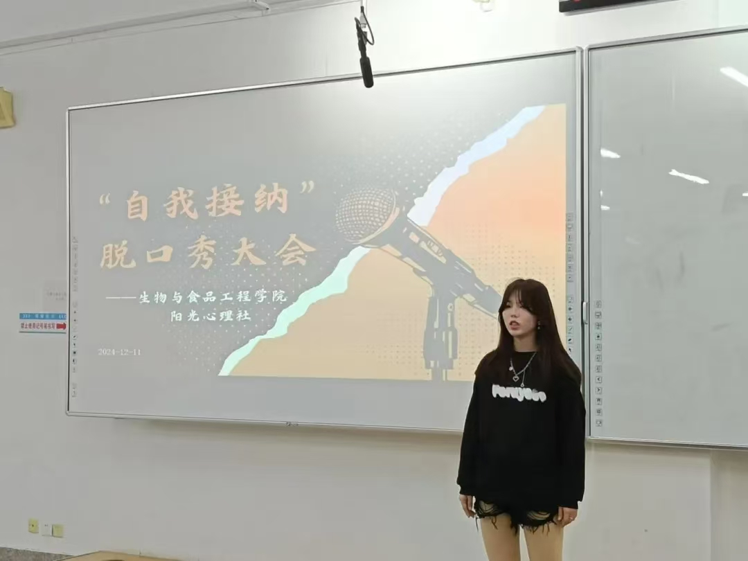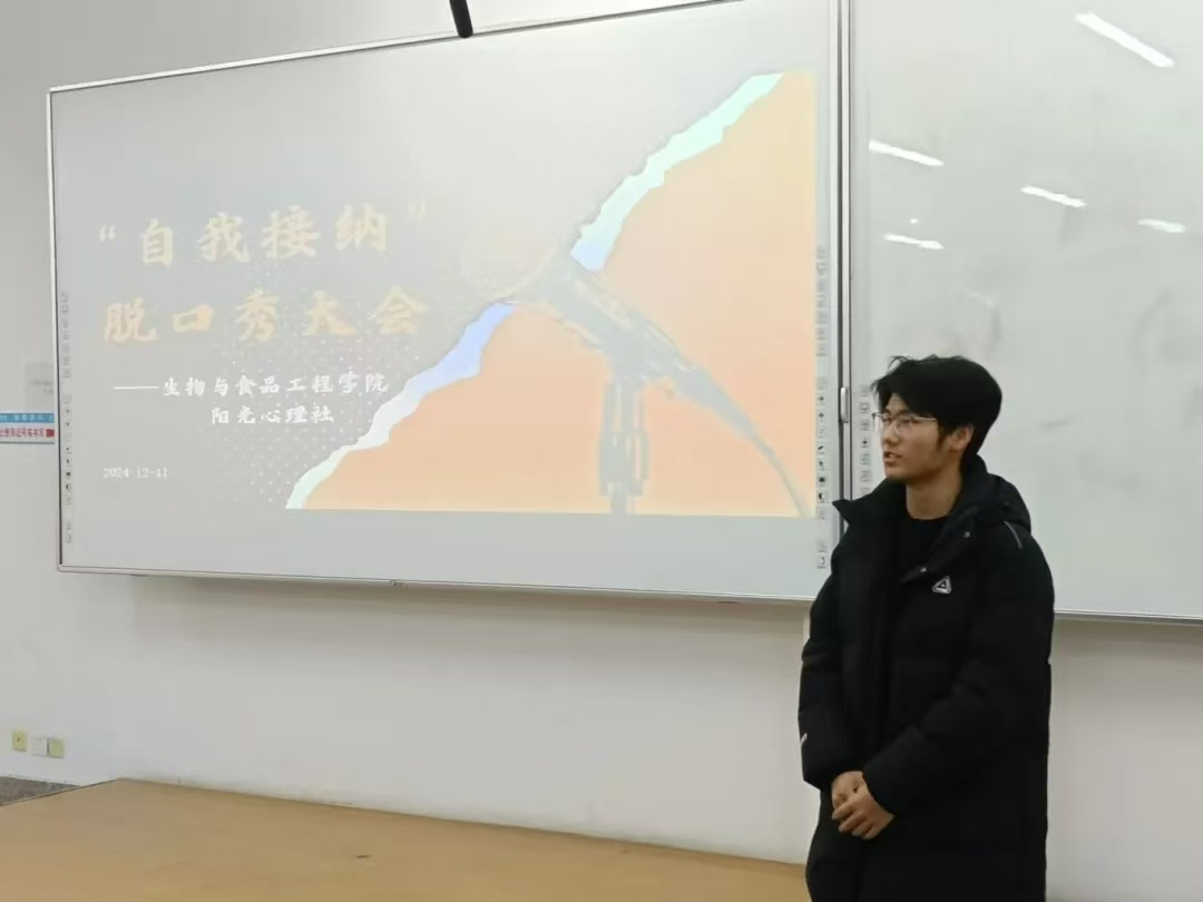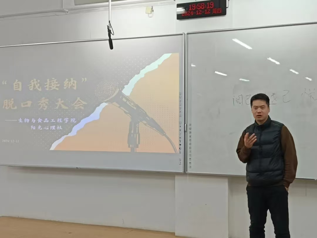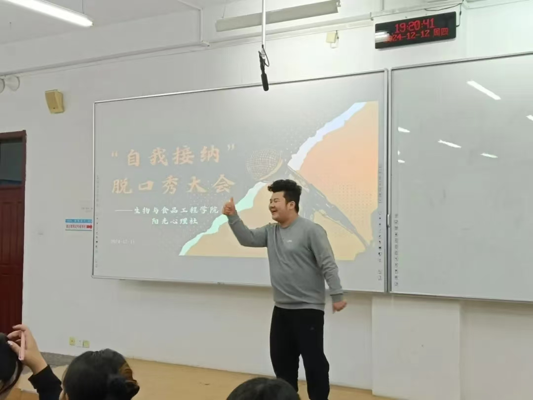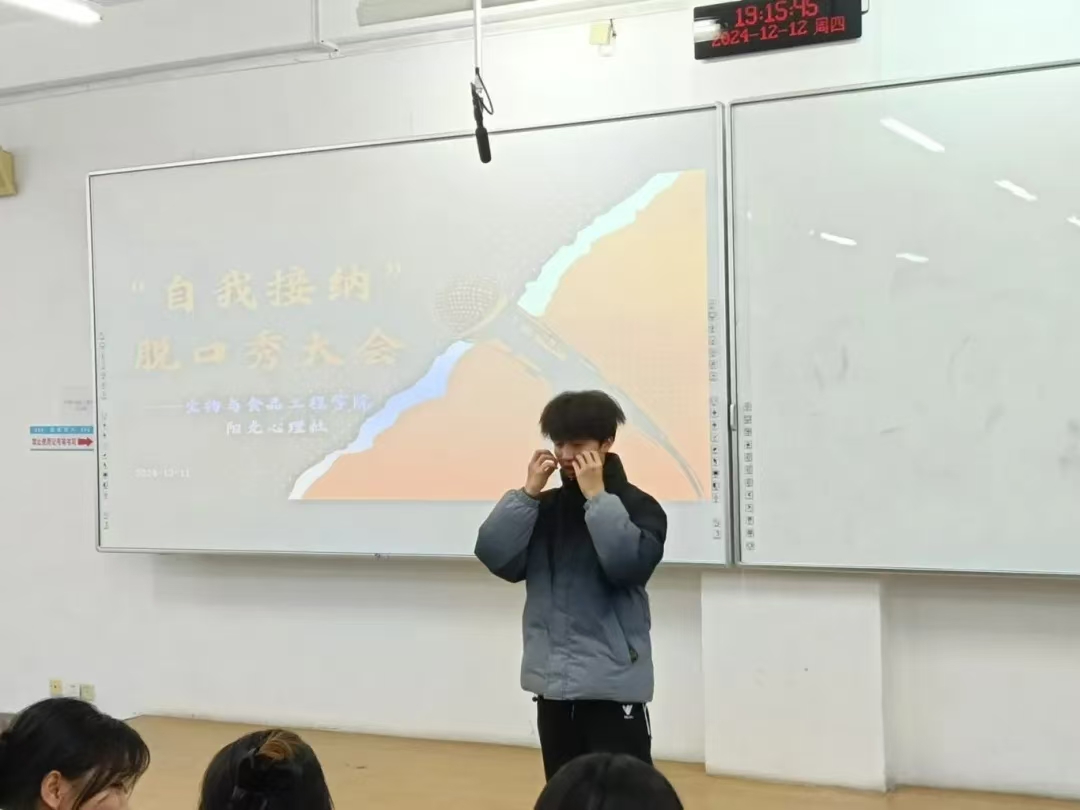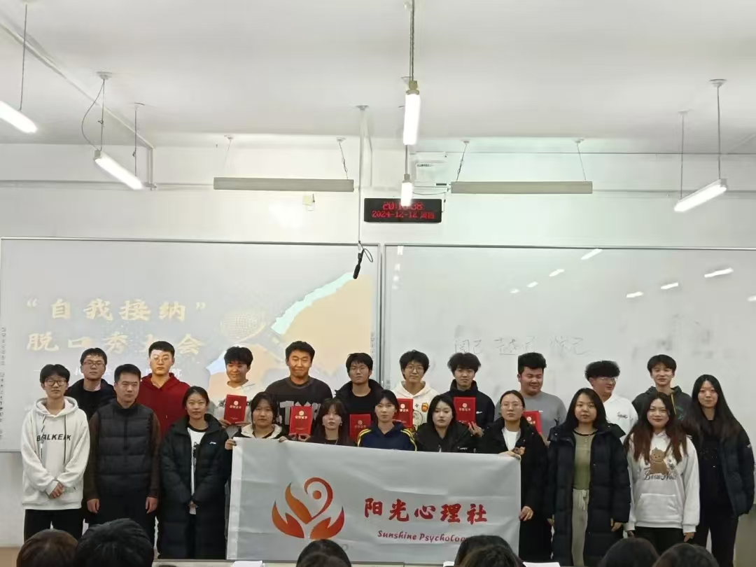 为关注大学生心理健康,使其深刻领悟自我接纳的内涵与重要性,学会接受自身的不完美,摆脱外界评价的过度束缚,培育积极健康的心理状态和自尊自信的人格品质,进而推动校园形成关注心理健康、倡导自我关爱与成长的良好文化氛围,英国上市公司365阳光心理社于12月12日晚上7:00在第三教学楼504室举办“自我接纳”脱口秀大会。学院学生办公室主任裴林出席本次会议,会议由徐晶晶同学主持,学院学生代表参加。