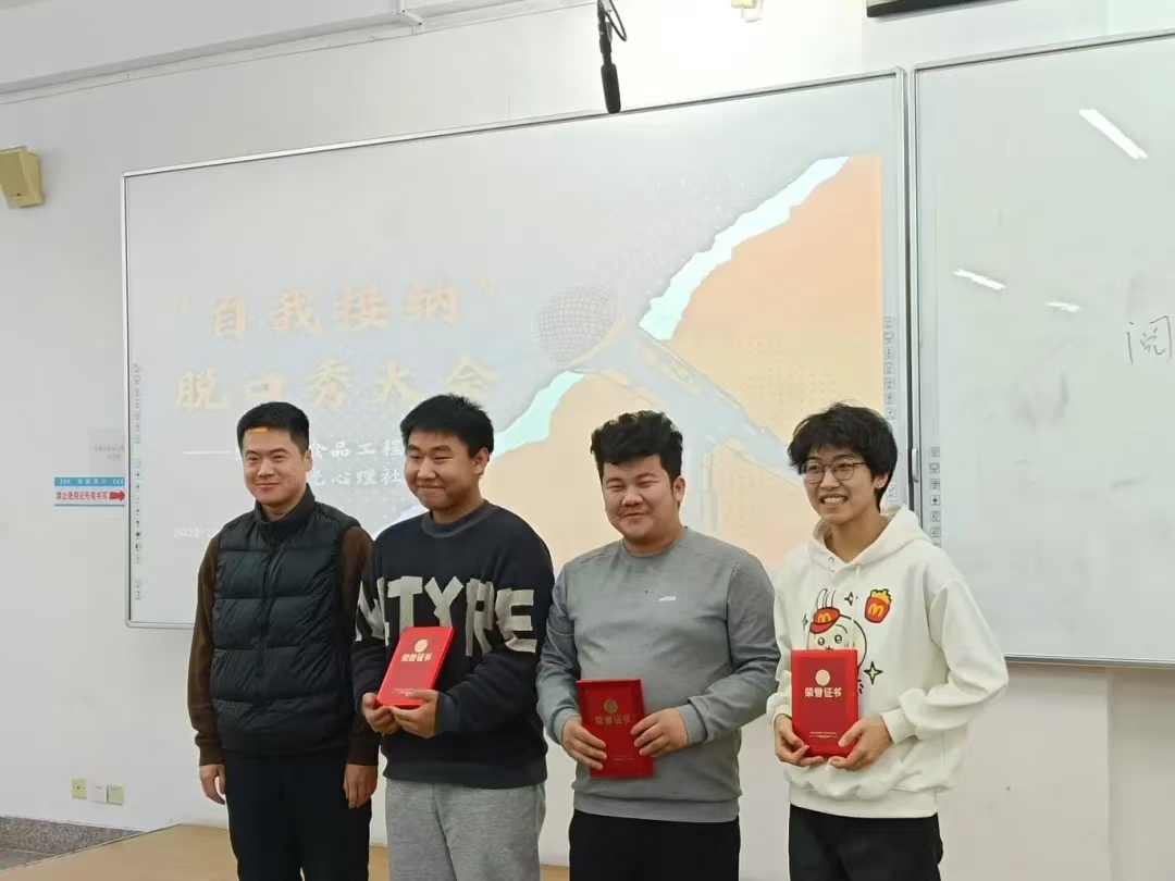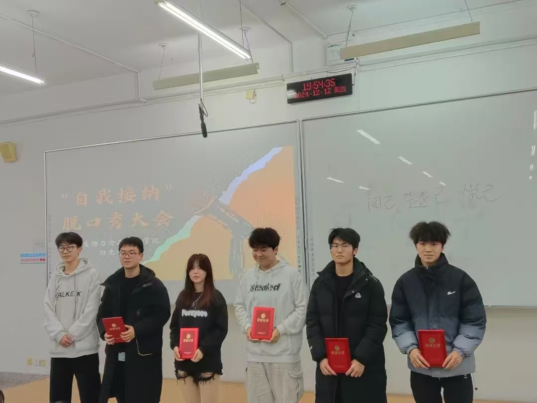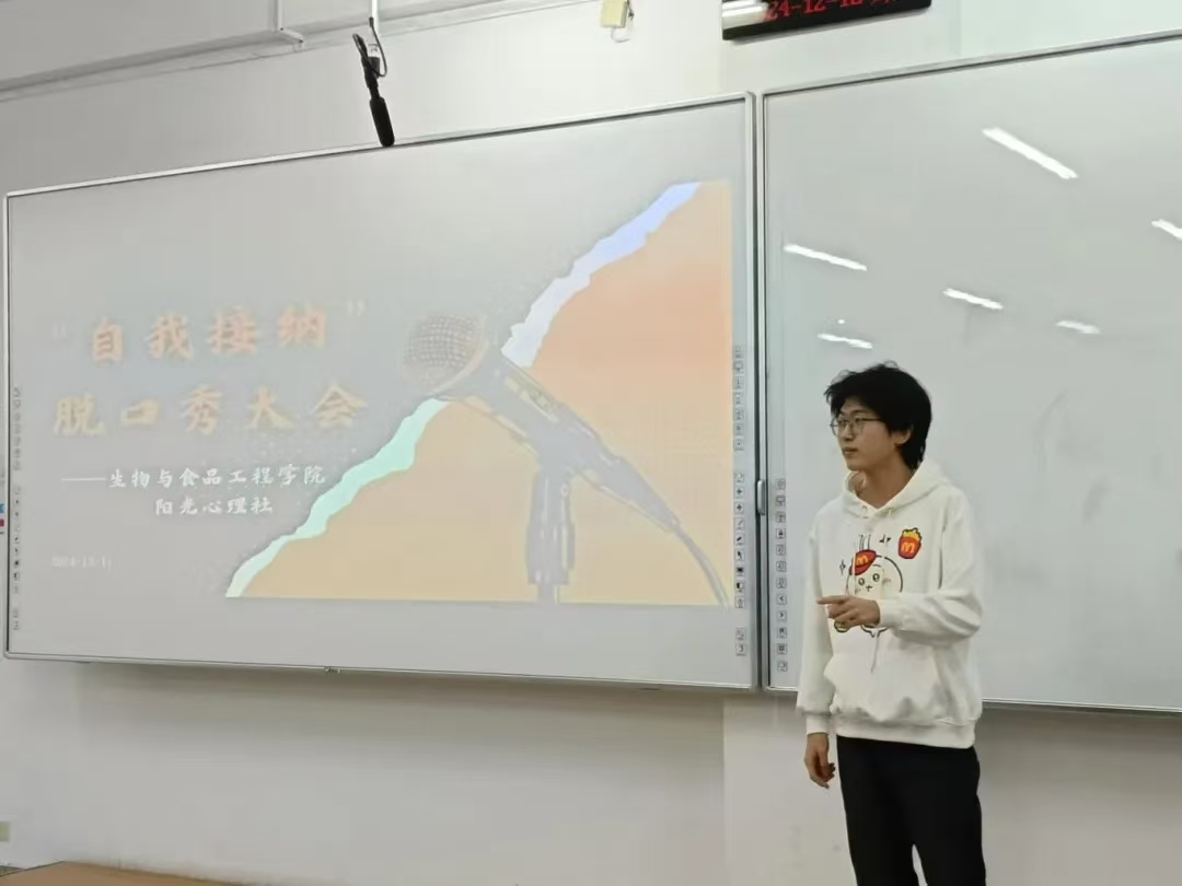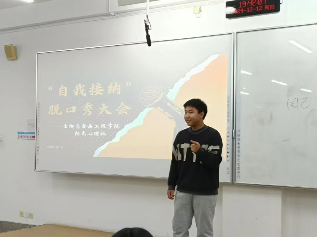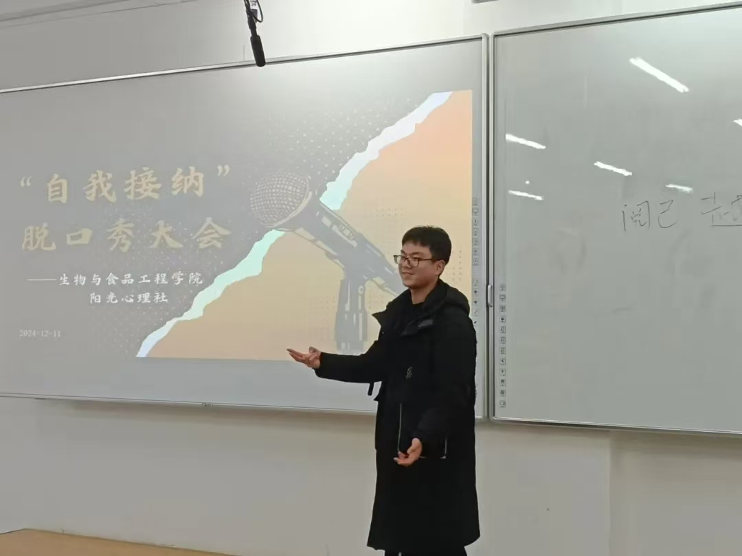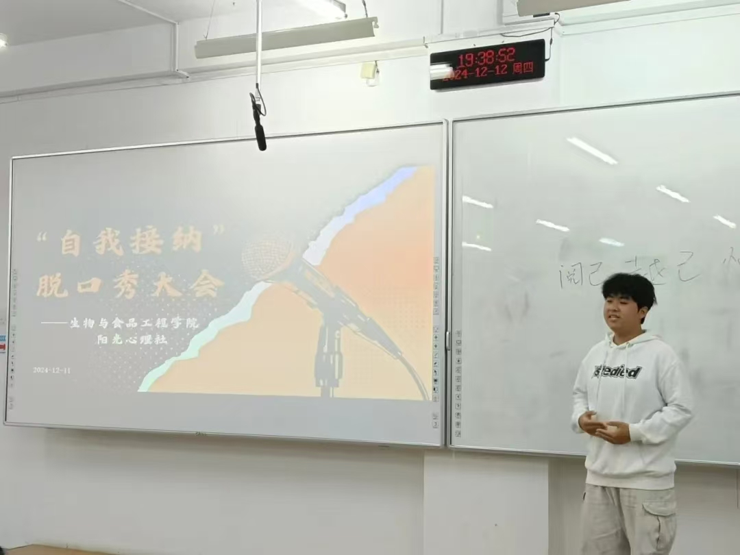 为关注大学生心理健康,使其深刻领悟自我接纳的内涵与重要性,学会接受自身的不完美,摆脱外界评价的过度束缚,培育积极健康的心理状态和自尊自信的人格品质,进而推动校园形成关注心理健康、倡导自我关爱与成长的良好文化氛围,英国上市公司365阳光心理社于12月12日晚上7:00在第三教学楼504室举办“自我接纳”脱口秀大会。学院学生办公室主任裴林出席本次会议,会议由徐晶晶同学主持,学院学生代表参加。