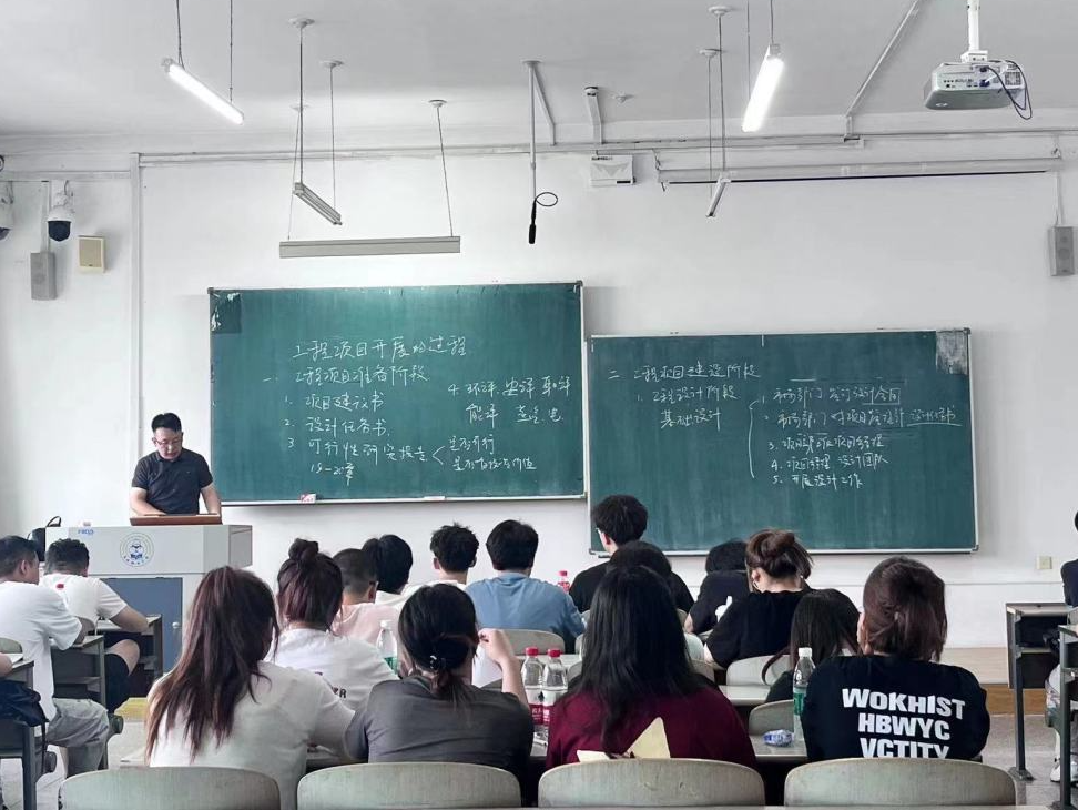 主任向学生们介绍工程设计的有关规范、规程等知识基础。整个工程主要分成两个阶段:工程准备阶段,工程建设阶段。项目准备阶段,首先需要完成项目建议书和任务设计书;随后需针对项目是否可行做可行性报告,并在最后对项目进行评估。工程建设阶段则分为两个部分:一,在评估结束后与市场部门签订相关设计合同,项目部派项目经理并组织设计团队,开展设计项目。二,建设单位和管理公司监理项目施工,完成试运行及试生产;最后进行技改以达成长期稳定运行。