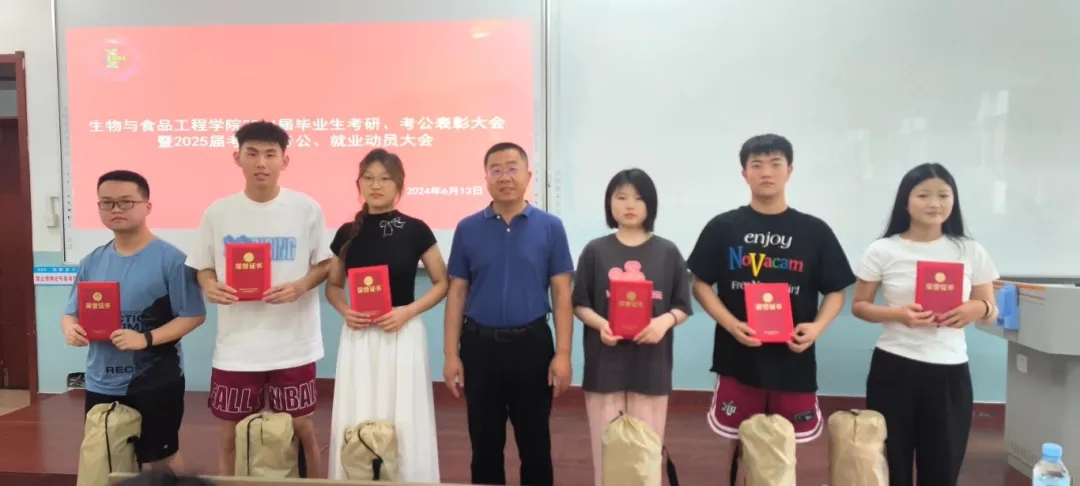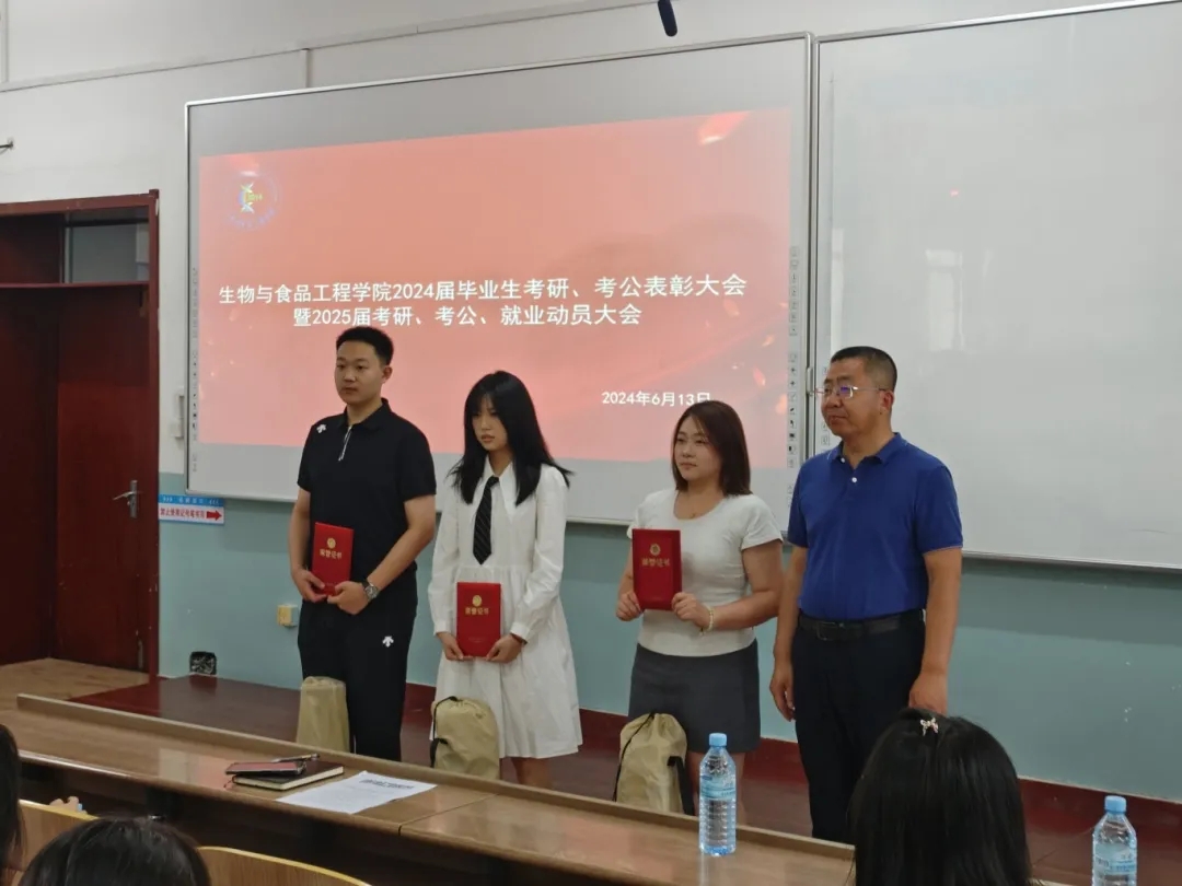 为了表彰2024届考研、考公学子的优异表现,激发2025届学生考研、考公、就业热情,向2025届学生传授考试经验,明确考研、考公、就业目标,英国上市公司365于2024年6月13日一教309举办了2024届毕业生考研、考公表彰大会暨2025届考研、考公、就业动员大会。本次会议由学生工作办公室主任裴林主持,学院院长张元新、学院党委副书记孙京南、食品科学与工程系系主任马先红、生物工程与技术系系主任谢莹、辅导员刘人宁老师、20级学生代表及21级全体学生参会。